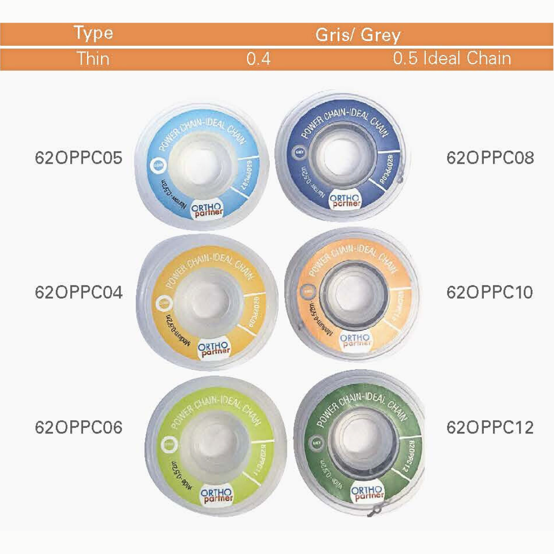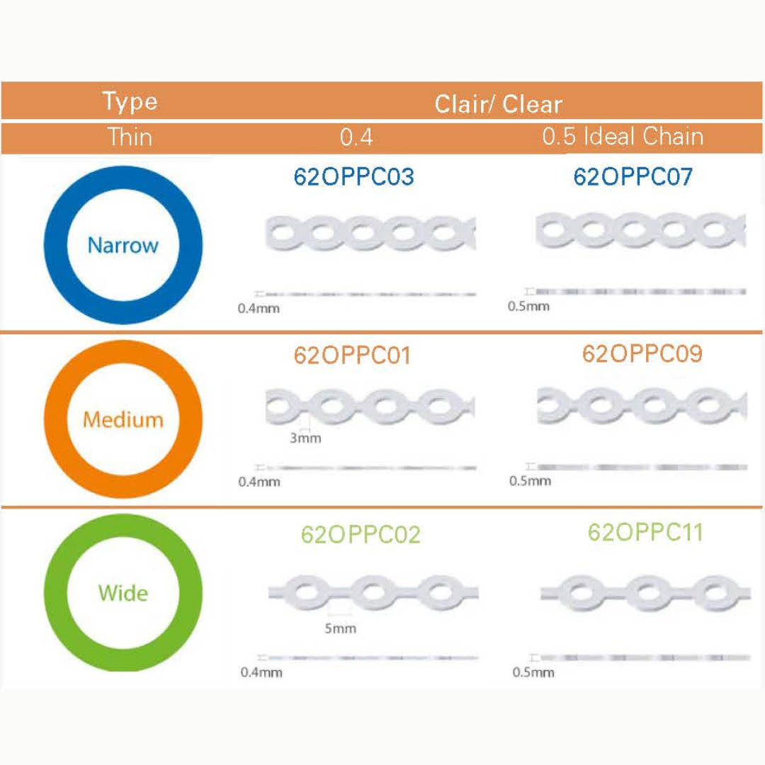 Thin chain delivering low forces for sensible perodontium. Available in clear and gray.